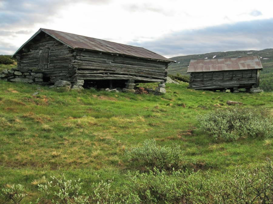 Huset til venstre er tilleggshytta og det til høyre er doen og der veden ligger
