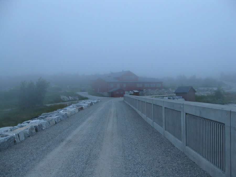 Har startet kl. 04.30 fra Aursjøhytta. Det er tykk tåke. Jeg skal gå over demningen