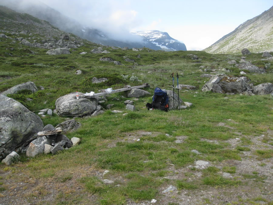 Her sitter jeg og spiser før jeg går innover Gravdalen. Jeg ser at slepa er merkt fint innover her. Tåken forsvinner