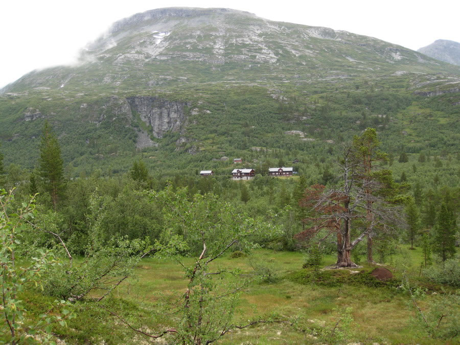 Ser ned på Reindalseter og 2000 år gamle falne furukjempa Storgadden.