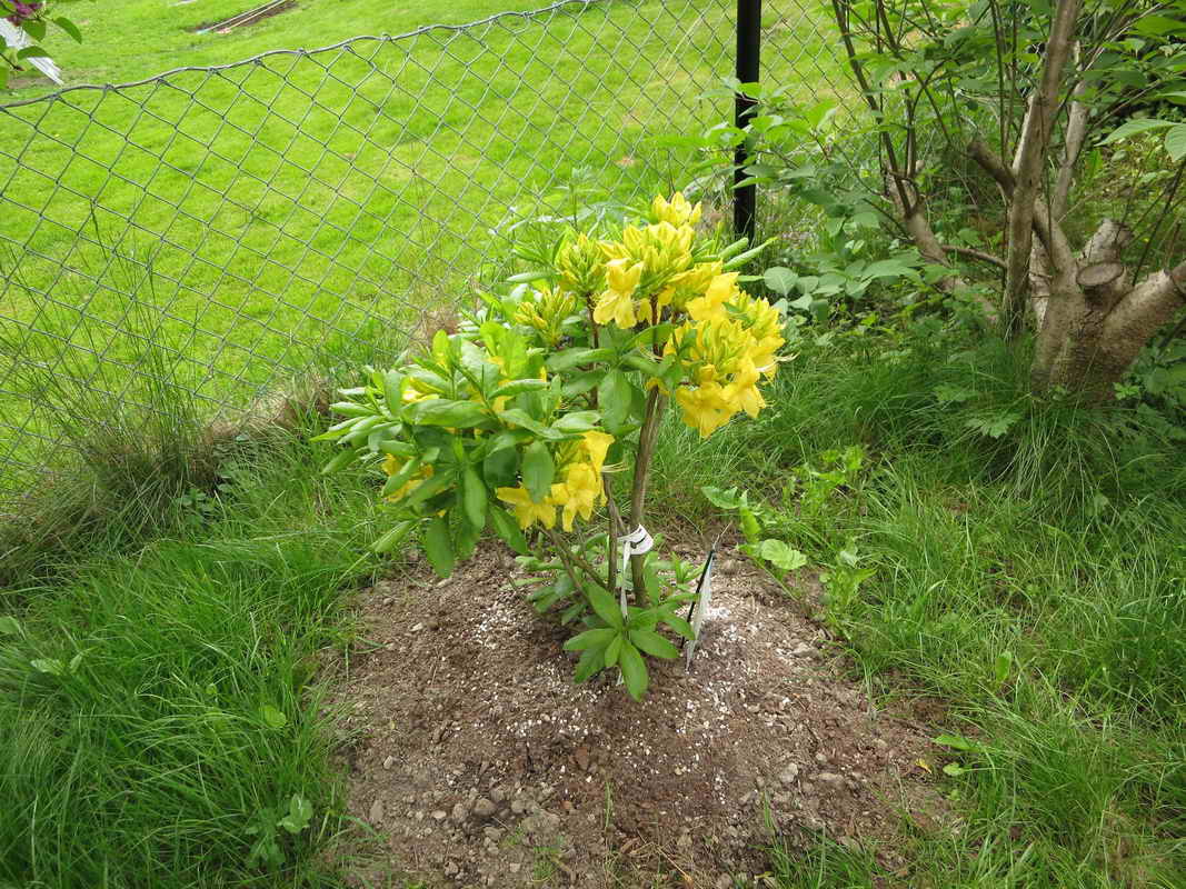 Her er en ny rhododendron jeg har plantet. Fin gulfarge.