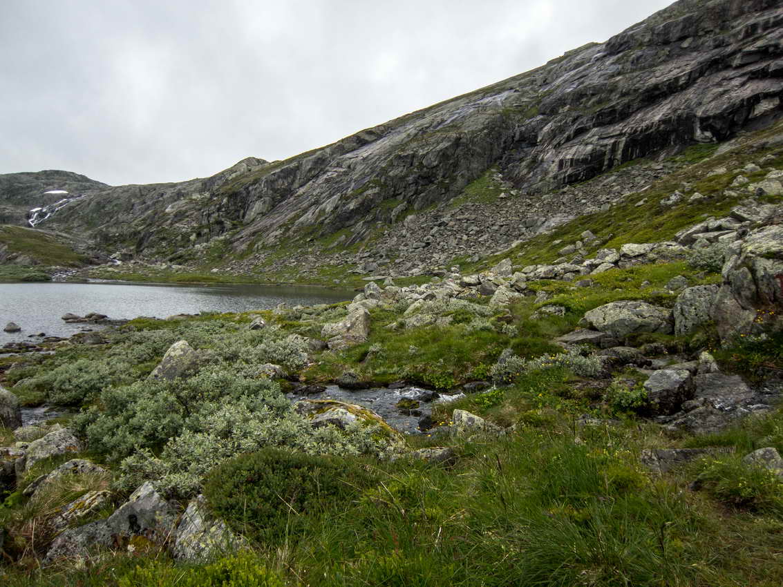 Har kommet til et lite vann etter 15 minuters gange. Jeg skal bratt opp til høyre på andre siden av vannet.