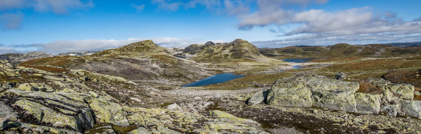 Har kommet opp på en liten topp på 1393 høydemeter på siden av stien. Ser ned på Mannvatnet helt til høyre.