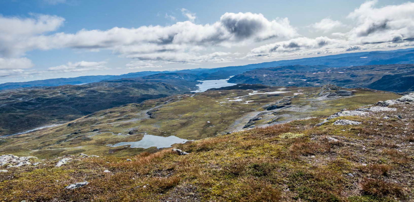 Ser mot nord/øst fra toppen. Jeg tror vi ser Årmotvatni langt der borte.