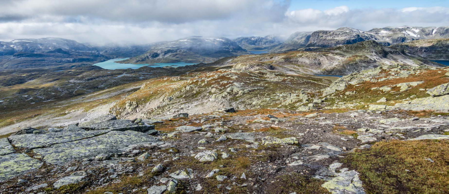 Er på vei ned fra Vesle Nup. Ser ned mot Ståvatn og Mannvasstjønn til høyre.