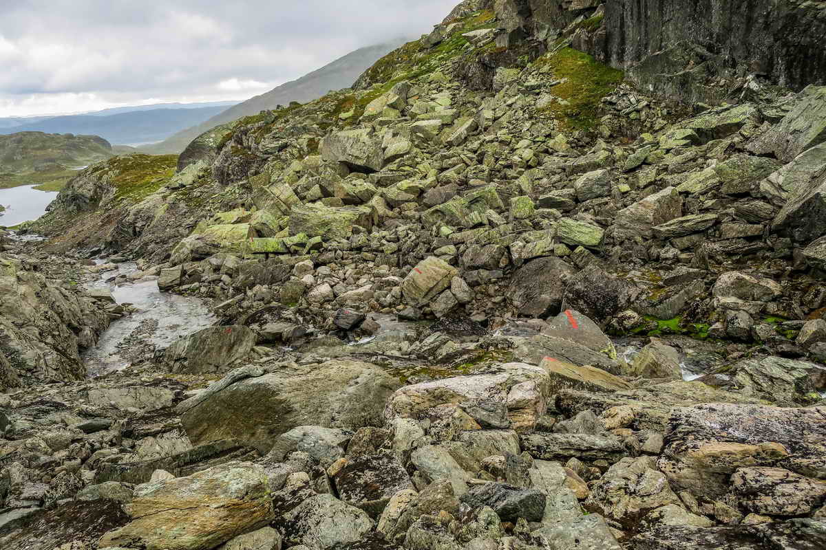 Må igjennom steinhaugen på høyre hånd.