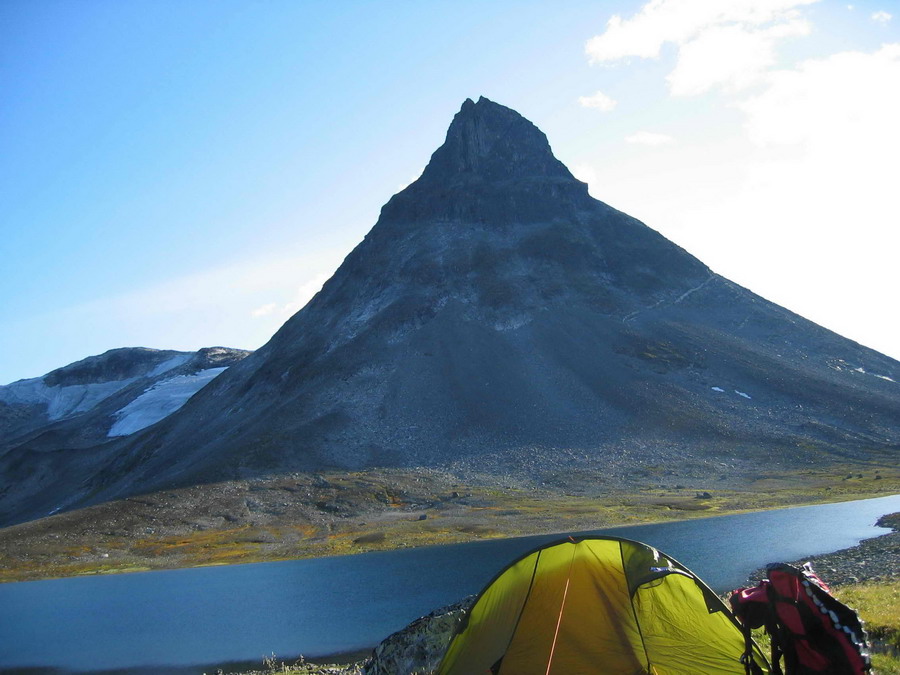 Her har vi Kyrkja i solskinn. Har funnet med en fin teltplass og det er nydelig vær.