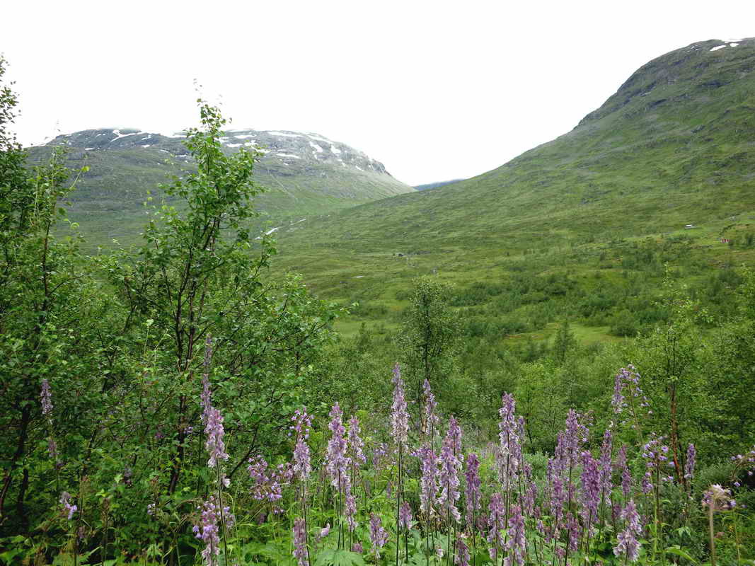 Her ser jeg over elva til Guridalen. Her ligger noen gamle nedlagte setrer.