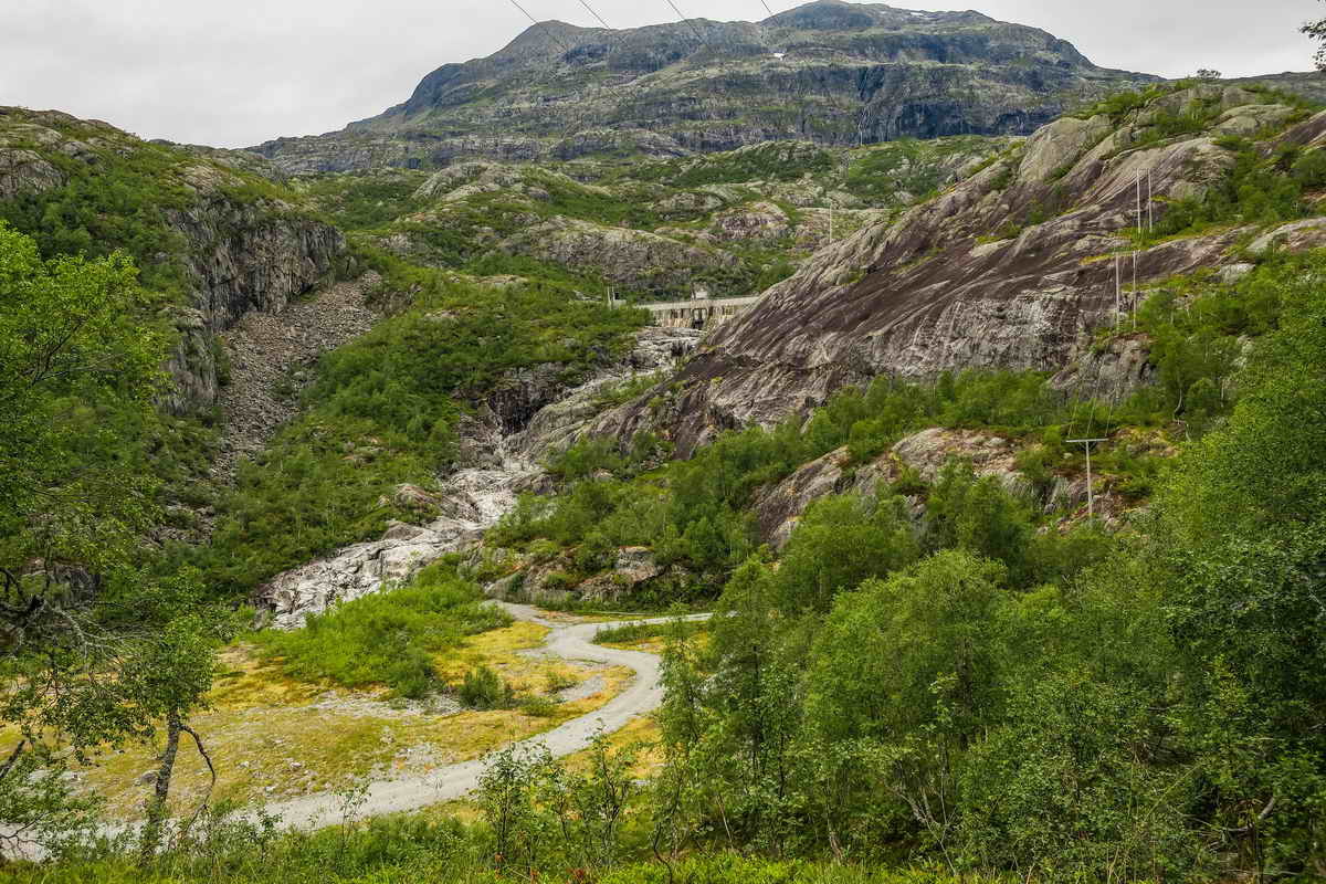 Her står jeg på det laveste punktet på veien og ser opp mot demningen. Nå går det 300 høydemeter opppover på grusvei.