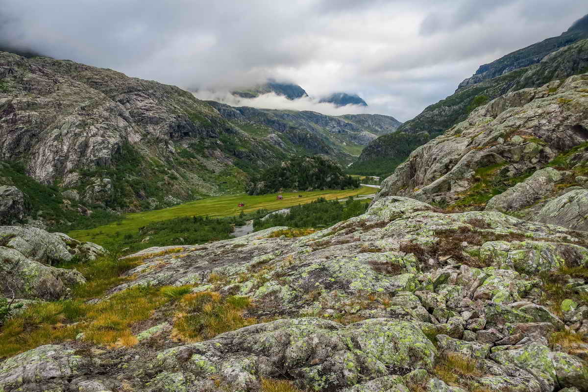 Klokken er 07.45 og jeg har rotet oppe i fjellet her en time. Det var for bratt for meg, så jeg snudde. Ser ned mot hytta i kvanndalen.
