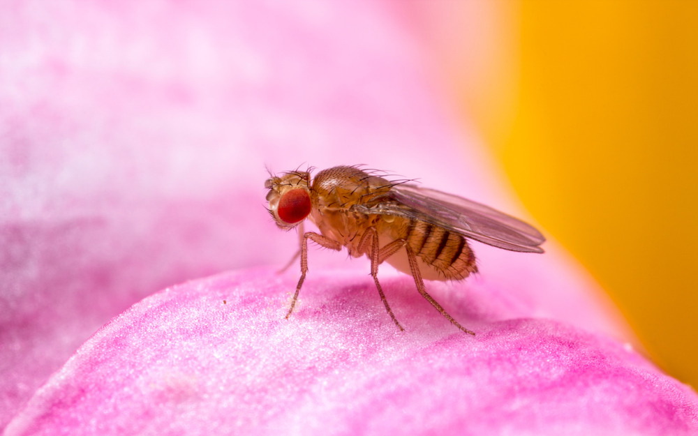 2mm lang Bananflue (Drosophila melanogaster). Objektiv Schneider Kreuznach componon 35mm