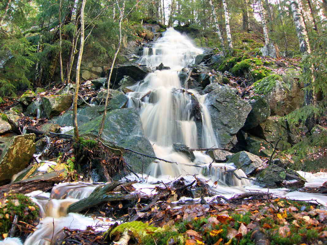 Vi fant fossen ved å følge lyden fra den. Jeg tipper det er omtrent 15 m fra bunnen til toppen av fossen.