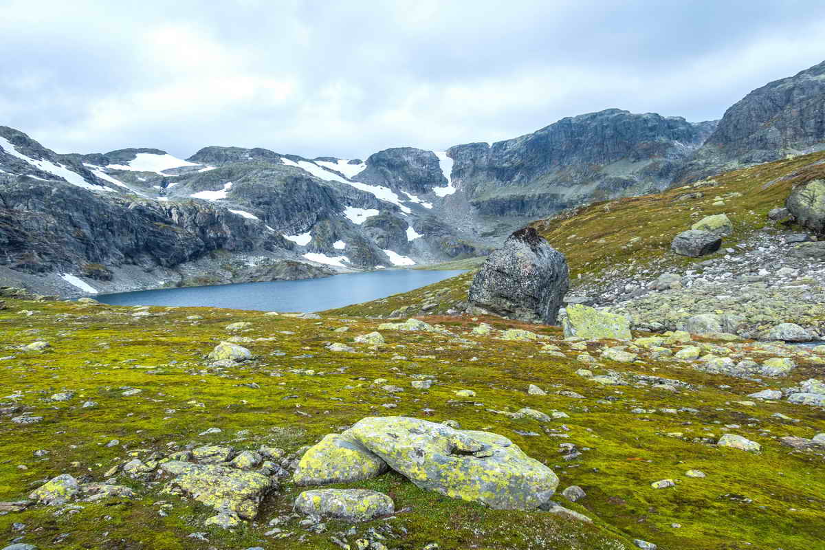 Ser ned på Trolltjønn. Bak fjellet her og inntil breen er det en topp på 1691m.o.h