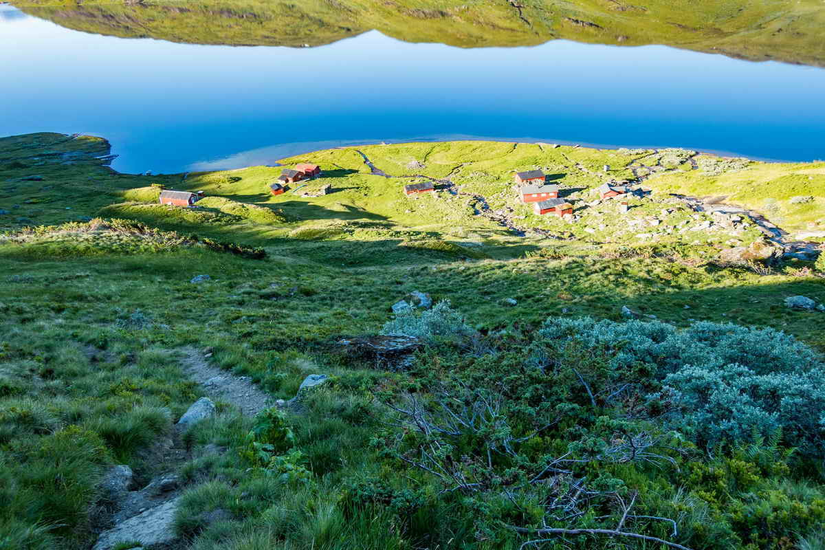 Har kommet opp til den første høyden og ser ned på Åsete. Det var ganske bratt opp her.