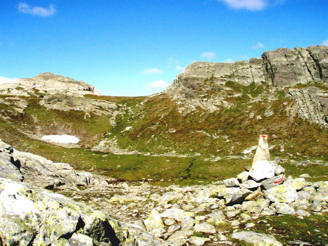 Dette er ved Vartetjønna. En kan se stien slynge seg opp fjellsiden