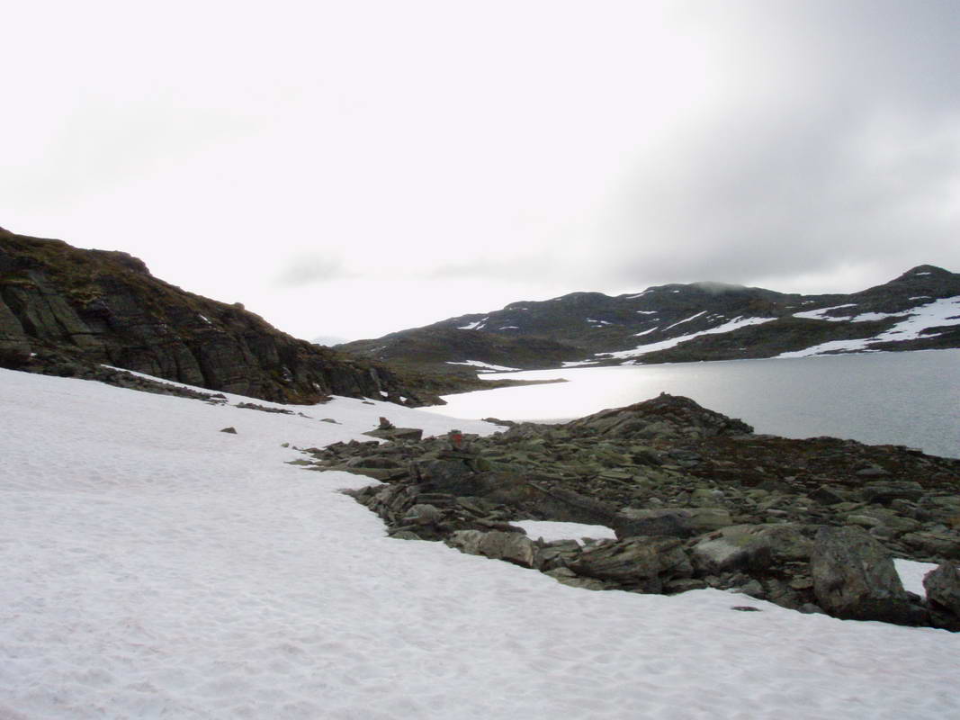 Veldig fint å gå her langs vannet selv om det er noe snø. Steinrøysa er det slutt på