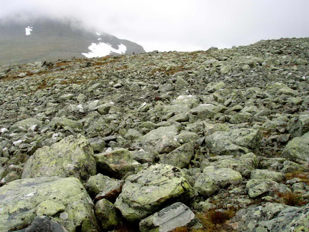 Fin steinrøys. Suletinden ligger innhyllet i tåke. Er snart ved Suleskardet.
