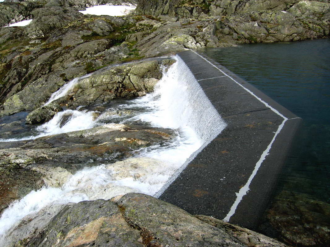 Denne demningen måtte jeg vade. Elva renner fra Kyrkjevatnet og ned i Breibottsvatnet. Den virket litt stri, men var det ikke.