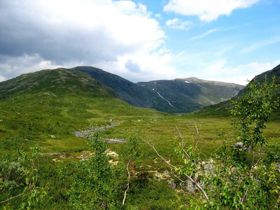 Fleskedalen ligger fin og frodig. Jeg skal opp på fjellet til venstre i bilde.