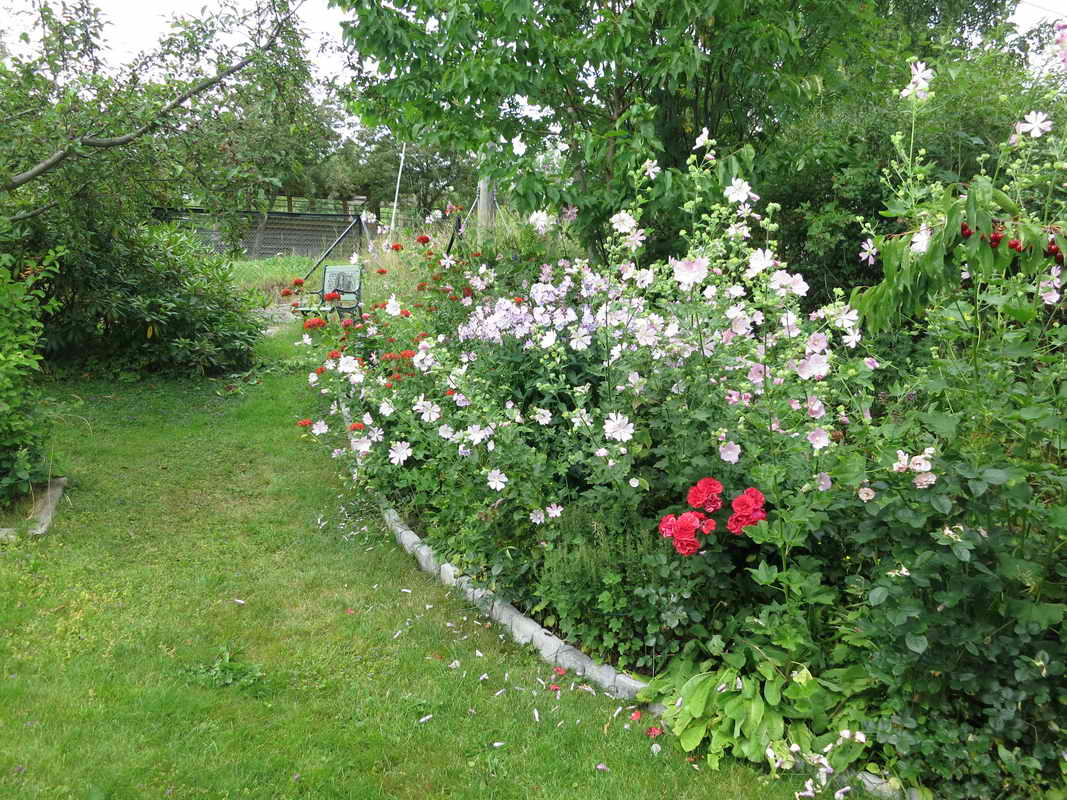 Lavateran har tatt helt overhånd i dette blomsterbedet. Neste år må jeg luke vekk noe.