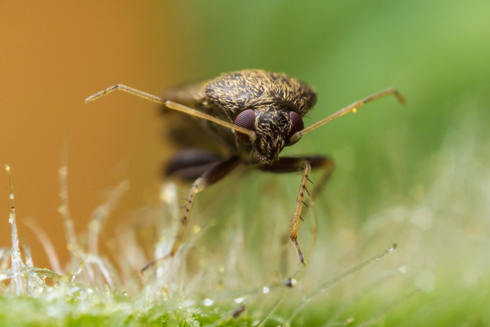 Liten Tege 3mm fanget av Pelargonium. Pelargonium har små klissete hår (Trichomes) på både blader, stilk og blomst slik at insekter som lander på platen lett setter seg fast. Objektiv Rodenstock Rogonar-S 25mm enlarger med rundt 8cm med mellomringer satt til F8 og reversert.