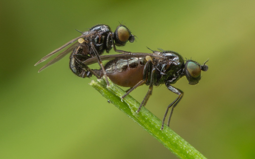 Bilder av veldig små Stråfluer fluer som parrer seg. 2mm lange Stråfluer (Chloropidae Oscinella)