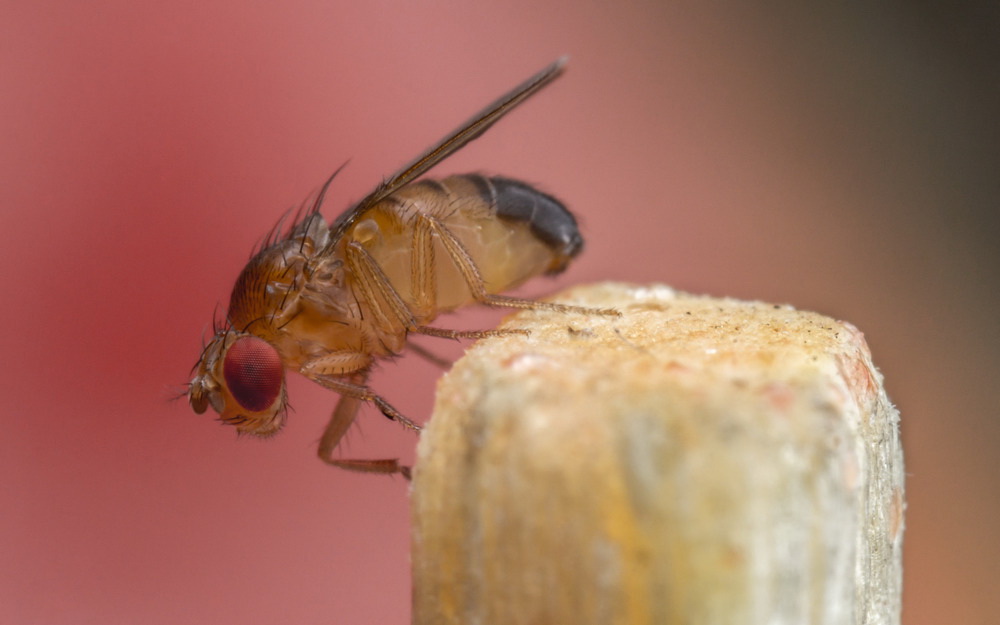 Bananflue (Drosophilida) sitter på en fyrstikk. Objektiv reversert schneider componon 35mm med mellomringer.