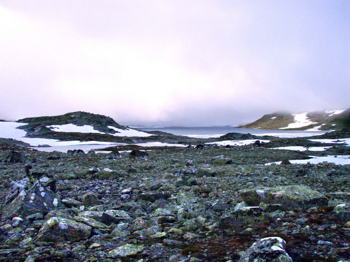 Finseå intersected eventually on all bridge and over a ridge at some 1,600 meters above sea level where the locked cabin Klemsbu is right on the other side (or. Nice to rest in the cabin wall). Moreover northeast of between Sankt Paul (1694 m) (left side) and Flakavassnutane (1746 m) on the right side. The former should have gotten its name by the English lord Garvagh they which was much in the area in the latter half of the 1800s. The rounded dome must have reminded him of the famous cathedral at home in London. At St. Paul has gone 6,7km.Both St. Paul and the westernmost of Flakavassnutane is fine detours with a great view, especially the latter (approximately 1 km east of the trail) with views Hardangerjøkulen and Hallingskarvet and completely against Gaustatoppen (1883 m) as well as parts of Jotunheimen to the north.