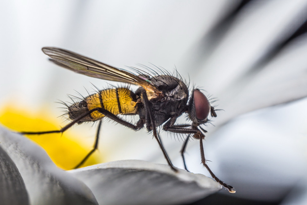 Flue Thricops semicinereus på en blomst. Objektiv reversert Rodenstock Rogonar-S 25mm.