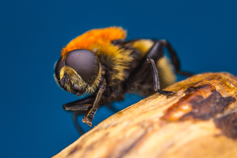 Not a bumblebee but Fly. A fly that resembles a bumblebee, probably one merodon. Objective: EL Nikor 50mm F2.8 Reversed.