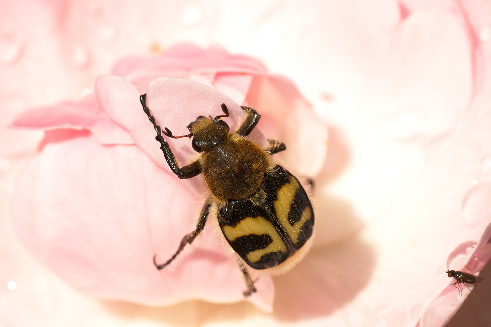 Hops beetle (bee beetle fasciatus) on Rose. Hops beetle climbing on a rose while a small fly watching.